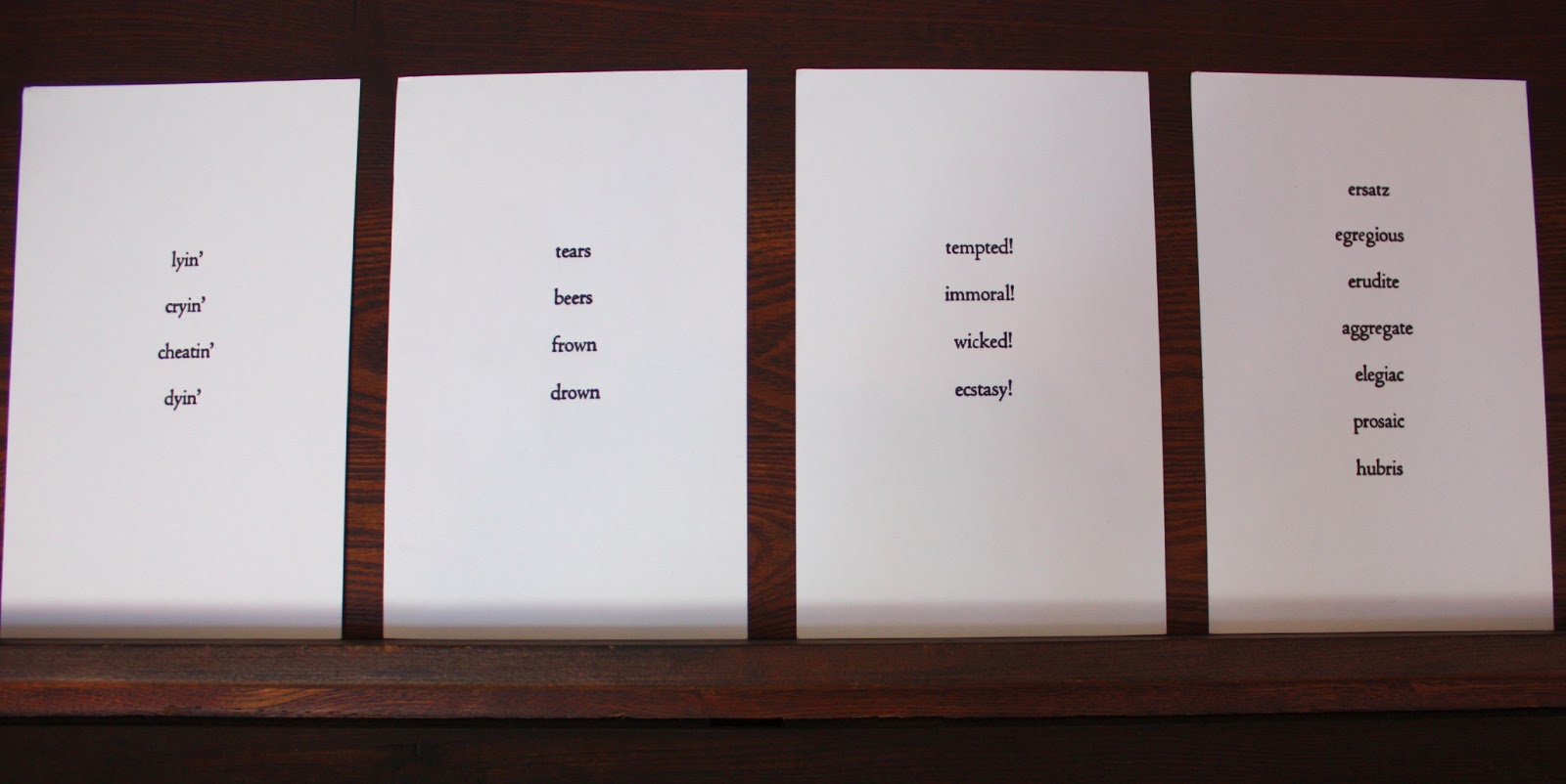 Je suis influencée par la langue vernaculaire de la culture populaire, par l'affichage commercial et le design graphique, du fait que la présentation formelle de ces mots est mise en contraste avec l’émotion ou la psychologie plus profond du message: le besoin normal, mais inavoué de validation, d'acceptation, d'approbation - et la crainte de son contraire: l'indifférence, la critique, le rejet.